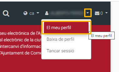 3-. Un cop "identificat" pot accedir a “El meu perfil” (fent clic en el seu nom que trobareu a la part superior, a dalt a la dreta en lloc d'"identifica't") per poder completar les seves dades i les dades de representació (certificats de representació – persona jurídica)