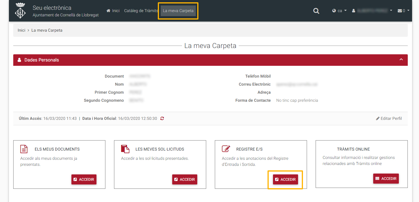 9-. Podeu consultar els vostres Registres d’entrada i sortida a la Seu Electrònica en l’apartat “La meva carpeta” > subapartat “Registres E/S”